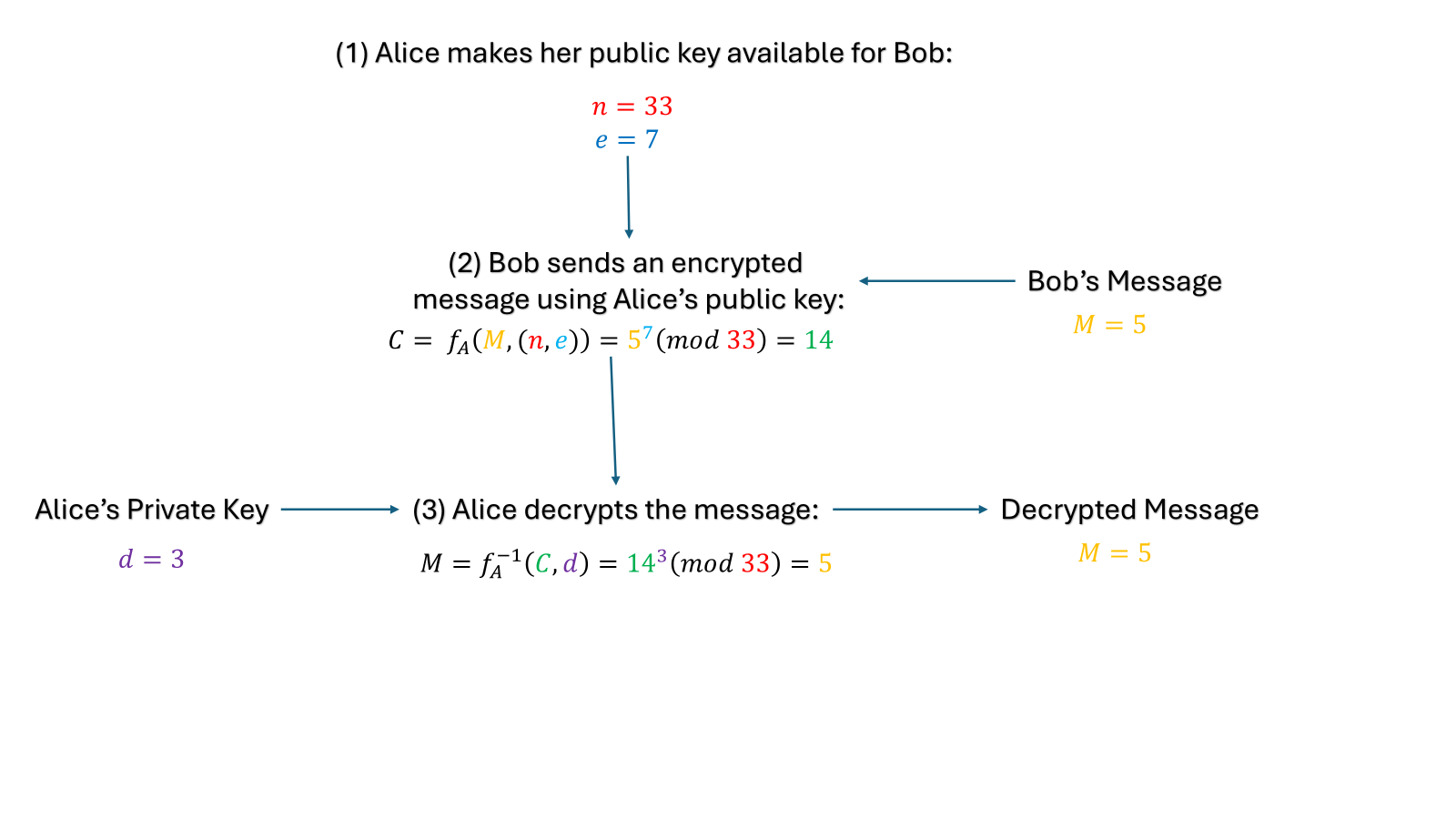 - $f_A^{-1}(C, d) = C^{d} (\text{mod } n)$